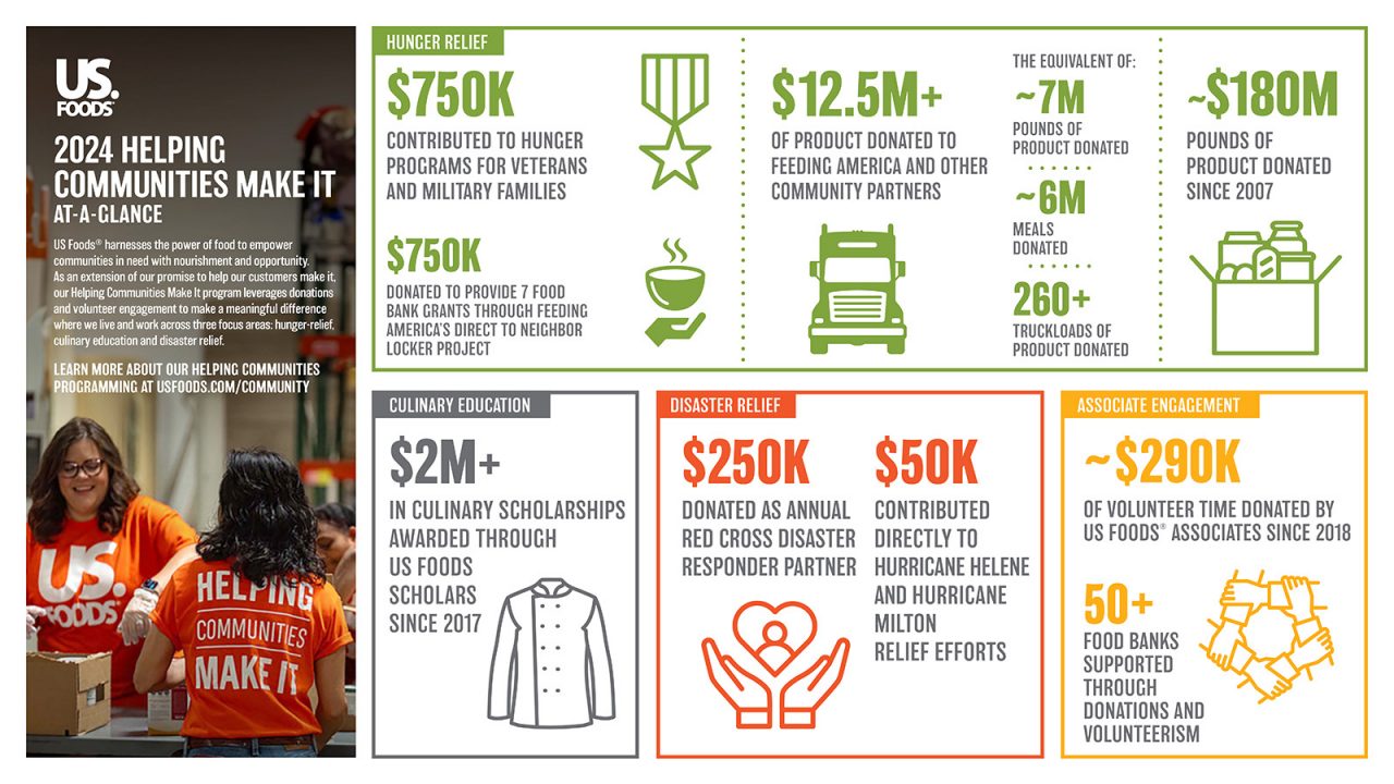 At US Foods, we empower our associates to give back in their local communities through annual volunteerism and donation campaigns, and equip them with the resources they need to uplift their communities year-round. In 2025, US Foods is launching its first-ever “Dollars for Doers” program, which rewards associate volunteer time with charitable funds that the associate can then donate to a charity of their choice. The company will also continue its associate engagement opportunities with three major company-wide giving events: Spring into Service, Hunger Action Month and the "Giving Gratitude” holiday drive.