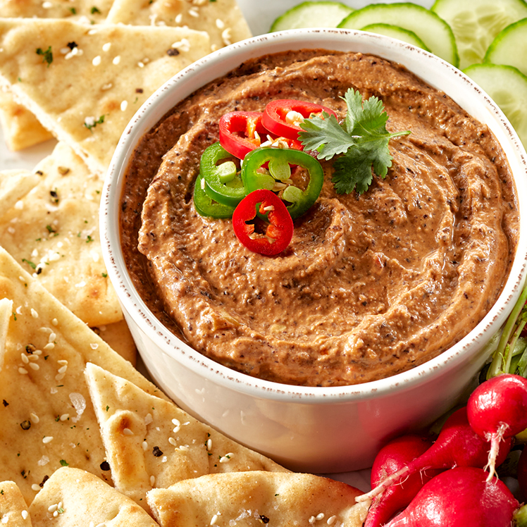 We’ve turned a classic on its head with this uniquely spiced take on hummus. Featuring ground chipotle pepper, black beans instead of chickpeas, and tahini, it boasts incredible flavor for unique applications. Obviously a great vegan* appetizer option, this hummus can also delight as a dip or salad dressing, or as a spicy spread on flatbreads, sandwiches and more.