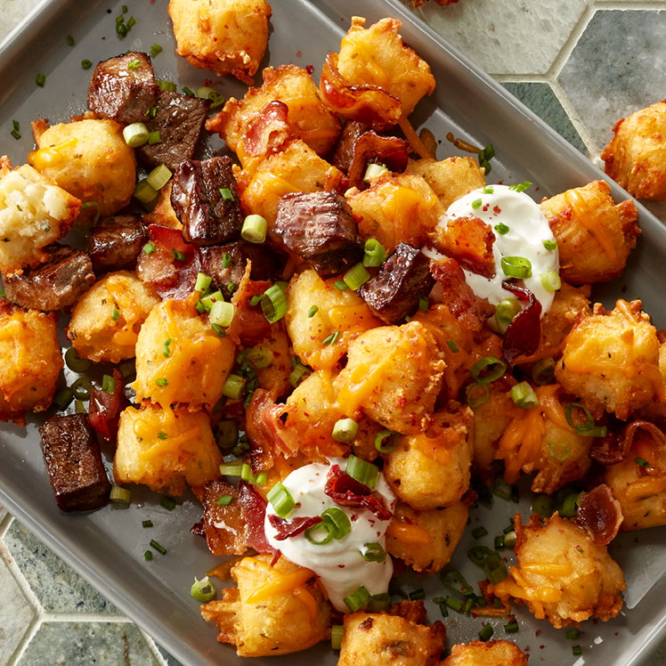 - Lightly seasoned loaded tots made with shredded potato, cheddar cheese, sour cream and chives with back-of-house–made appearance