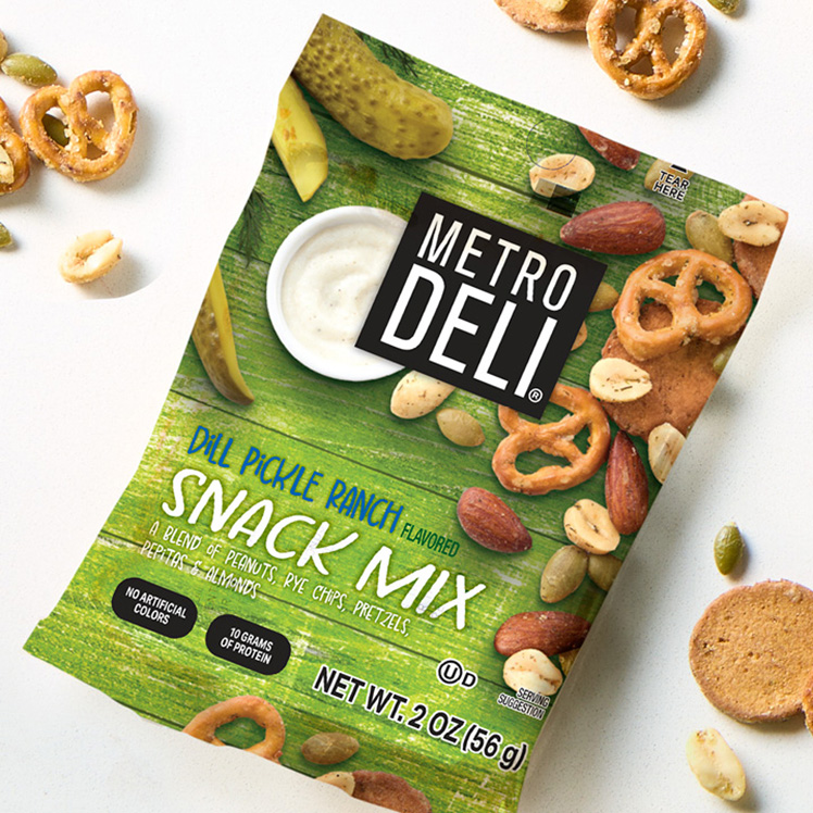 Jump on the pickle-flavored trend with this ‘dill’-icious snack! Metro Deli® Dill Pickle Ranch Snack Mix combines bold and tangy flavors with a curated selection of ingredients to satisfy adventurous snackers. This blend includes oil-roasted peanuts, pepitas and almonds combined with garlic chive seasoned rye crisps and mini twist pretzels. Dill pickle seasoning ties everything together with its refreshing zest, making this crunchy, salty snack mix not only tasty but irresistibly addictive.