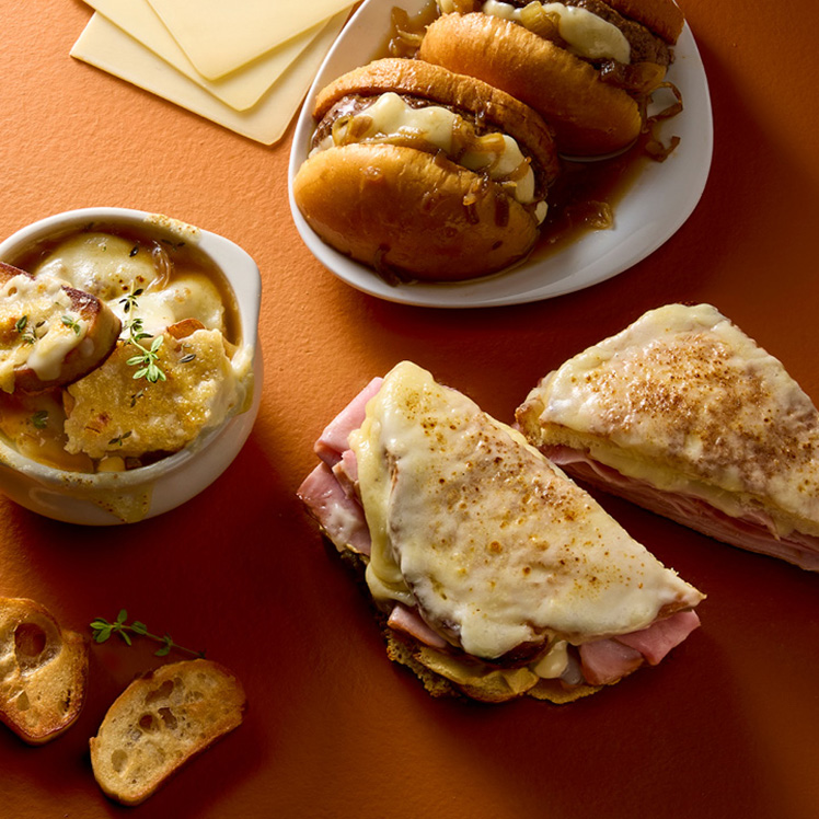 Metro Deli® Gruyère Cheese Slices are a testament to the art of traditional cheese-making. Crafted in imported copper vats, our cheese undergoes a meticulous process of cooking and curing on spruce boards for a minimum of four months. Following time-honored Swiss-Alpine techniques ensures a nutty, full-bodied flavor with subtle floral undertones that enhance any dish. This unique cheese-making process is not often found in Gruyère cheeses on the market for foodservice today. Elevate burgers with its gooey melt, or elevate french onion soups, omelets, paninis and gratins – the possibilities are endless.