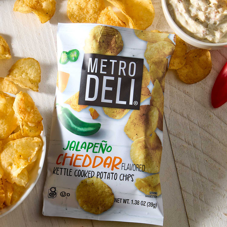 Back by popular demand, our Metro Deli® Jalapeño Cheddar Kettle Chips deliver a big crunch with the delicious flavor combination of spicy jalapeño and cheddar cheese. Jalapeño heat is balanced by rich and savory cheddar cheese, creating a bold, satisfying snacking experience. The thickly sliced Grade A potatoes are cooked in batches for that iconic crunchy kettle-cooked texture, with green flecks of pepper and an orange hue that gives the chips the appearance they deserve. As part of our Serve You portfolio for well-being, the Jalapeño Cheddar Kettle Chips are Gluten-Free Certified, contain no ingredients found on the US Foods® Unpronounceables List®* and are Kosher Certified.