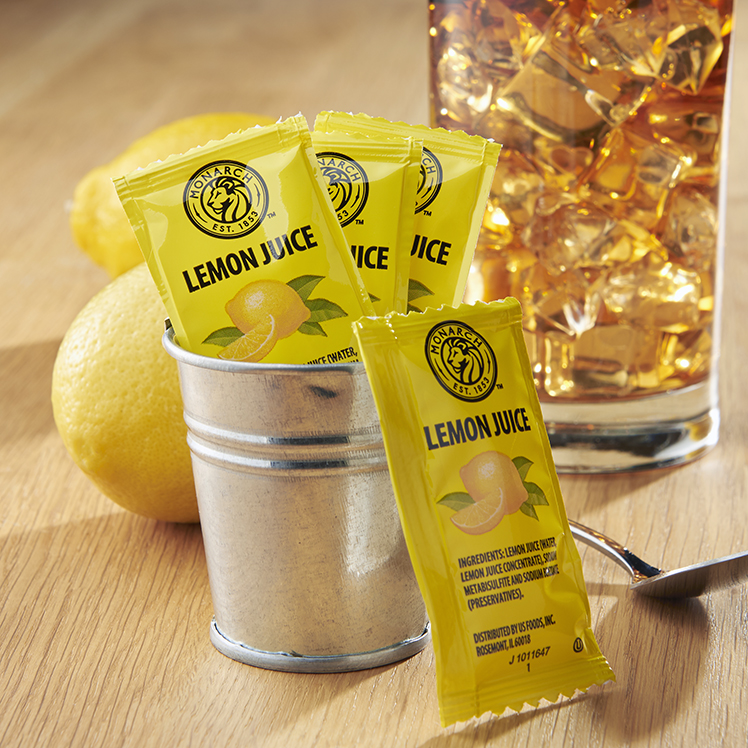 Monarch Lemon Juice comes in convenient single-serving pouches, ready to add to tea or water or to sprinkle on seafood dishes. The single-serving packs reduce waste and are ideal for takeout orders.