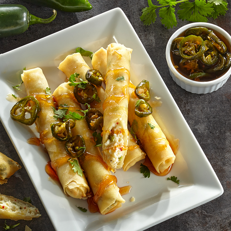 - Mexican-style melting cheese and cotija cheese, cream cheese, red pepper flakes and jalapeño pieces, hand-rolled in a spring roll wrapper
