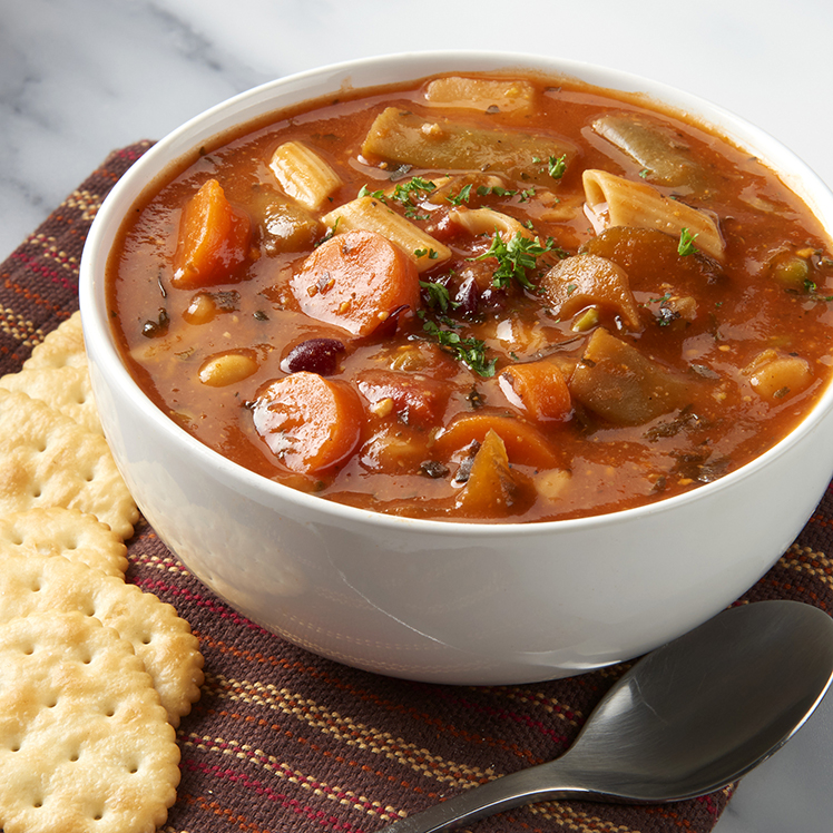 An Italian classic, containing a colorful array of garden vegetables, including green beans, tomatoes, kidney beans, garbanzo beans, potatoes and zucchini.