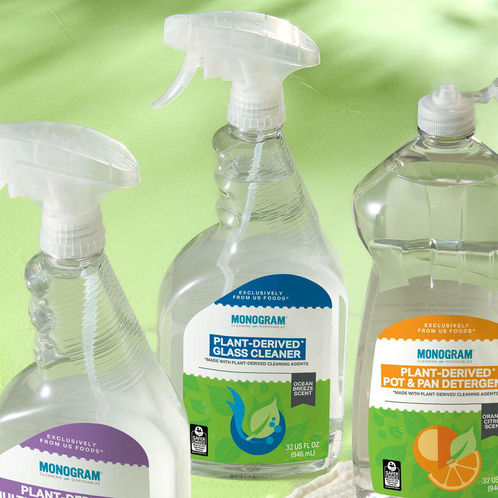 Monogram® Plant-Derived* Cleaners offer effective cleaning for foodservice kitchens – using plant-based ingredients without chemicals such as chlorine, ammonia, phthalates, phosphates or parabens. These products deliver strong cleaning results with light scents, are U.S. EPA Safer Choice label**, and meet EPA restrictions on levels of VOCs. Each bottle contains 25% post-consumer recycled content, making them a planet-friendly choice for any kitchen. These products can help you clean confidently and thoughtfully – no matter the mess or the surface.