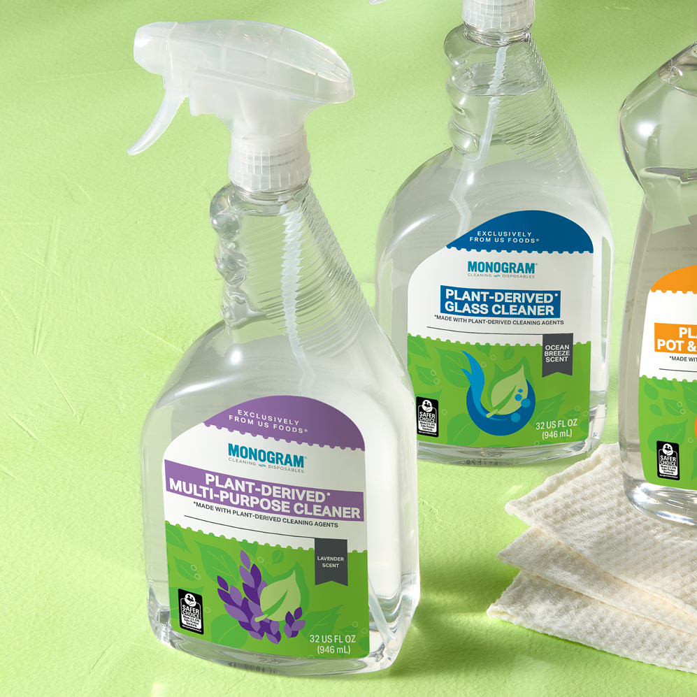 Monogram® Plant-Derived* Cleaners offer effective cleaning for foodservice kitchens – using plant-based ingredients without chemicals such as chlorine, ammonia, phthalates, phosphates or parabens. These products deliver strong cleaning results with light scents, are U.S. EPA Safer Choice label**, and meet EPA restrictions on levels of VOCs. Each bottle contains 25% post-consumer recycled content, making them a planet-friendly choice for any kitchen. These products can help you clean confidently and thoughtfully – no matter the mess or the surface.