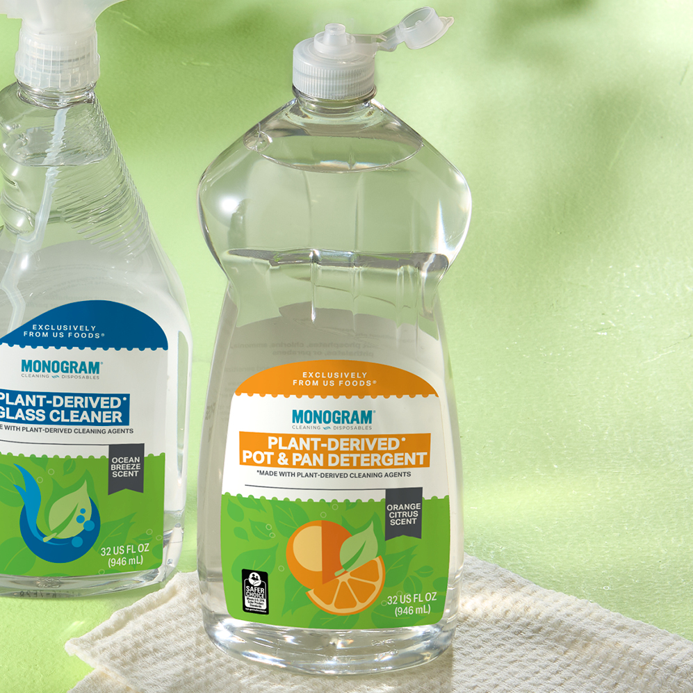 Monogram® Plant-Derived* Cleaners offer effective cleaning for foodservice kitchens – using plant-based ingredients without chemicals such as chlorine, ammonia, phthalates, phosphates or parabens. These products deliver strong cleaning results with light scents, are U.S. EPA Safer Choice label**, and meet EPA restrictions on levels of VOCs. Each bottle contains 25% post-consumer recycled content, making them a planet-friendly choice for any kitchen. These products can help you clean confidently and thoughtfully – no matter the mess or the surface.