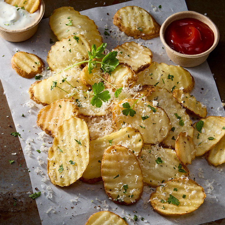 - Large, circular shape skin-on french fried potatoes with a crinkle cut to add a crisp crunch