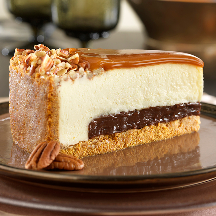 - Chocolate, caramel, and pecans are a perfect pairing for this New York Style Cheesecake