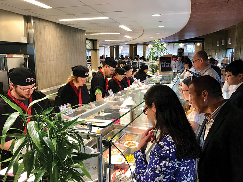 Students – and their parents – want to know they’re getting a good value from their meal plans. But value today is about much more than the quantity of food served, Toong says. It’s an equation that balances quality, sourcing, storytelling, creativity and more. Years have passed, for example, since UMass offered an eight- or 10-ounce steak. The only people who ate such large portions of meat were dads visiting the school, he says with a laugh. Students are looking for better-quality meat in smaller portions. The university also offers half sushi rolls and outsources custom-made bagels that are an ounce smaller than standard. “People want to eat less, eat more often and eat better,” he says.