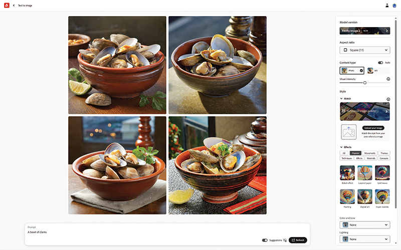 Create an account on Firefly by accessing Adobe online, and start with a free plan. Enter a prompt such as “a bowl of clams.” Hit “generate.”