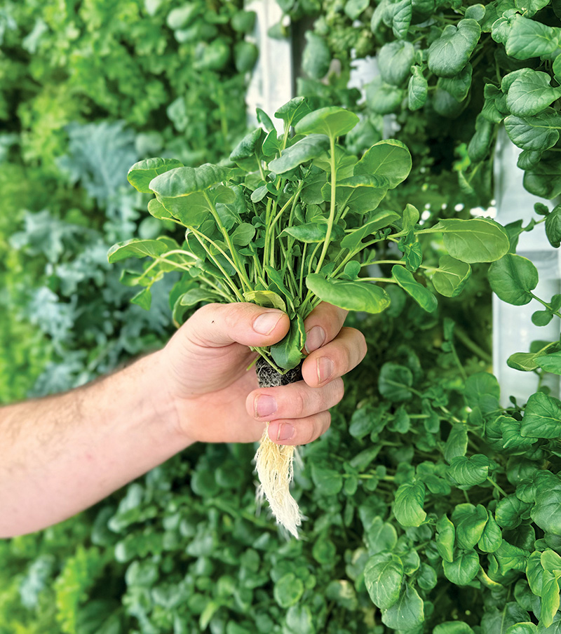 Justin Cucci of Edible Beats, which operates six restaurants in Denver, installed a 320-square-foot vertical hydroponic farm at his restaurant Vital Root, providing the restaurant with heirloom kale, arugula, tat soi, mustard greens and more while using 99% less water than traditional farms.