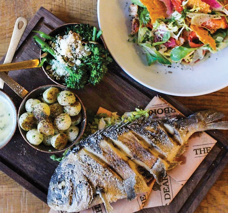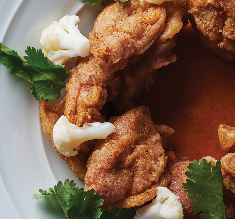 At Rosaline in West Hollywood, California, Zarate’s ensalada de beterraga (beet salad) begins with a vibrant stripe of magenta-colored beet purée. “The rest of the dish is a consistent pattern of burrata, beets and microgreens that are all placed the same distance apart so it’s all very clean and angular,” Zarate explains. “The scattered, popped quinoa was my way of making an otherwise symmetrical, angular dish more interesting.”