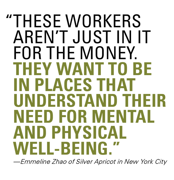 Better financial incentives, more equitable pay structures, and improved benefits all go a long way but still are not enough to address all of the underlying issues. “There are tons of restaurants that are offering signing bonuses and higher wages, but they’re still struggling to hire,” Zhao says. “That’s because these workers aren’t just in it for the money. They want to be in places that understand their need for mental and physical well-being.”