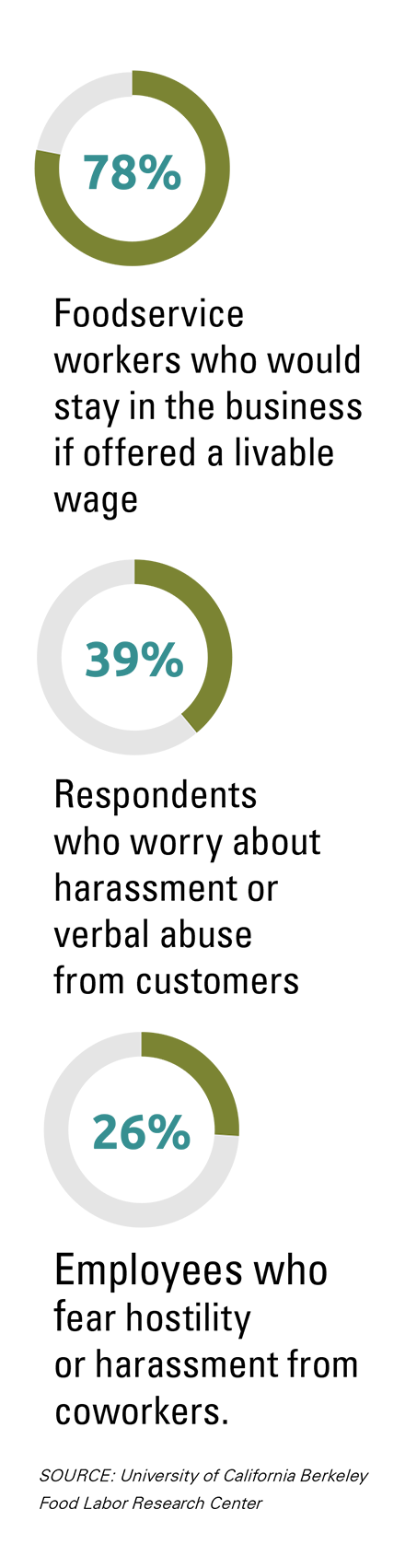 To be clear, it’s not so much a labor pinch but a wage shortage, according to advocacy group One Fair Wage, which sites a recent study conducted by the University of California at Berkeley Food Labor Research Center. It says 78% of foodservice workers would stay in the business if it offered a livable wage, while 39% worry about harassment or verbal abuse from customers, and 26% feared hostility or harassment from co-workers. In other words, many of the frustrations that have led to restaurant workers leaving predate the pandemic by decades.