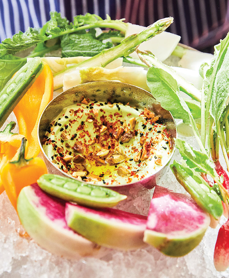 ❱ Guests would never guess the spring pea hummus at Wood in Chicago started with Sabra hummus. Chef Devin Keller blends spinach and spring peas into the prepared hummus, seasons it with cumin and lemon zest, and tops it off with blanched spring peas and crispy chickpeas for a restaurant-quality dish. “Seasoning is the key and brings new freshness to the final product,” he says. The hummus is also paired with grilled chicken.