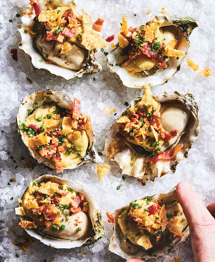 ❱ At Chicago’s El Che Bar, Chef John Manion grills most of his proteins over an open fire, and guests love watching the leaping flames. Grilled oysters are an impressive sizzling dish that Manion and his team can quickly cook up on the live fire grill, with a seasonal garnish prepped in advance. Think smoked onion aioli, bacon bits and crushed potato chips, and in summer he turns to sweet corn, lime aioli, cilantro and tortilla chips.